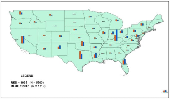 The primary method of summarizing the data will consist of maps of the numbers or percentages of standing stallions in each areal unit in the earliest available year, which varies by breed, and in the most recent year, which is 2017 for both breeds. Subtotaled data were match-merged into the ESRI Arc-Map GIS program for this purpose. In our maps of the 48 contiguous states and Puerto Rico, data bars for the early year and for 2017 are shown side by side for each state. These bars represent each state’s percentage of the total number of stallions standing in each year. Because we use percentages and not raw counts, these national scale maps depict the change in the geographic distribution of stallions: The eye is not misled by the significant decline over time in the absolute number of registered stallions across all states.