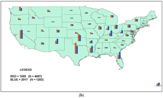 Figure 2. (a) Top-tier Thoroughbred stallions: Percentage of U.S. total in 1995 and 2017. (b) Lower-tier Thoroughbred stallions: Percentage of U.S. total in 1995 and 2017.
