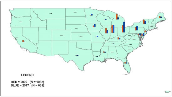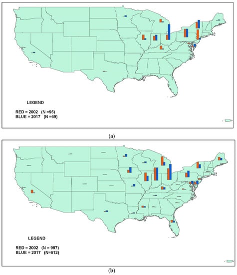 The data on national Standardbred stallions included a code for state of residence for each year. Therefore, it was not necessary to match zip codes to higher-level geography before creating subtotals for U.S. states. For the case study on six Northeast/Mid-Atlantic states, however, Standardbred data were collected at the zip code level (see above). These data were matched to county FIPS codes using a procedure similar to that described above for Thoroughbreds, except that the year 2000 MCDC crosswalk file was used for the year 2002 data, and the 2017: Q1 HUD crosswalk file was used for the year 2017 data [46,47].