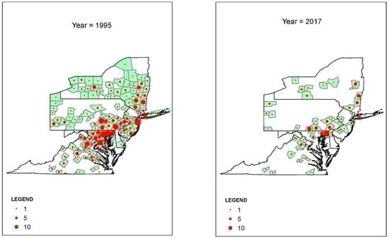 Figure 5. Thoroughbred stallions: Number of head in 310 Northeastern and Mid-Atlantic U.S. counties, 1995 and 2017.