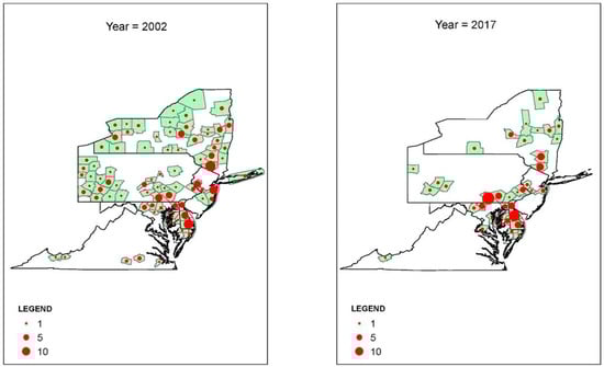 Figure 6. Standardbred stallions: Number of head in 310 Northeastern and Mid-Atlantic U.S. counties, 2002 and 2017.