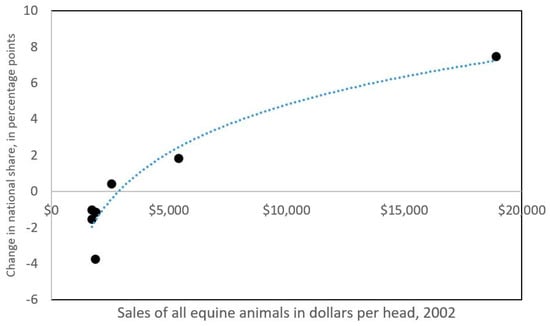 Figure 7. Change in national share of registered Thoroughbred stallions, 1995–2017, as a function of state equine dollar sales per head in 2002.