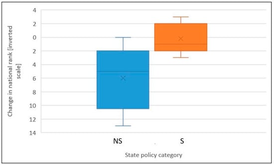 Figure 8. Box and whisker plots of change in national rank for supportive (S) and non-supportive (NS) states for Standardbreds.