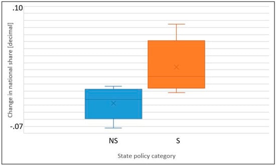 Figure 9. Box and whisker plots of change in national share for supportive (S) and non-supportive (NS) states for Standardbreds.