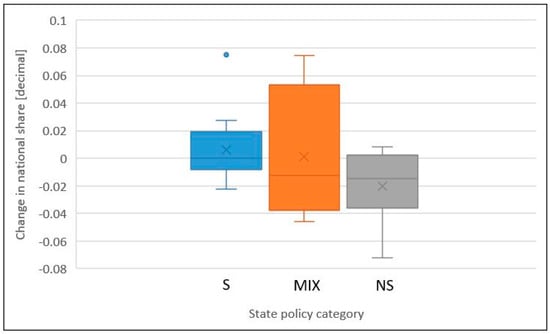 Figure 10. Box and whisker plots of change in national share for supportive (S), mixed (MIX), and non-supportive (NS) states for Thoroughbreds and Standardbreds combined.