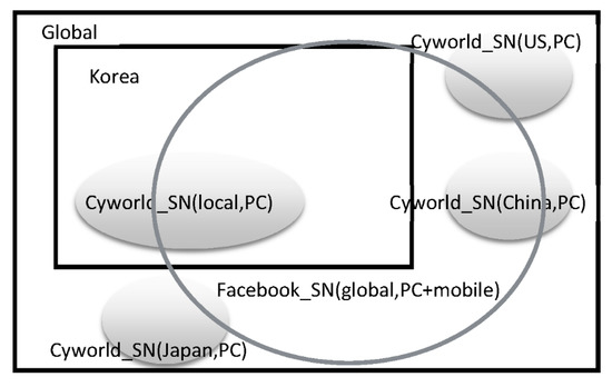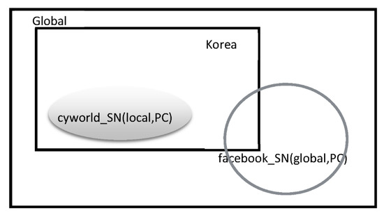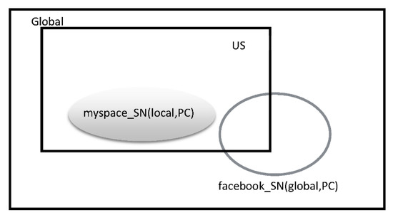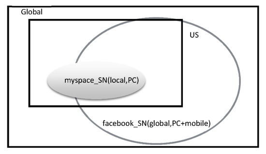 In Figure 7, Facebook_SN (Global, PC + mobile) means Facebook used the global network and used PC + mobile, Myspace_SN (local, PC) means that Myspace focused on domestic (i.e., the USA) social networks rather than global ones and it also focused on PC networks rather than mobile ones.