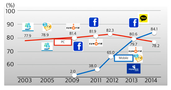 In 2013, in the US, most users accessed SNSs through their PC rather than their mobile device because the mobile penetration rate was not that high yet in the US. Facebook had already surpassed Myspace in the US in terms of monthly active users, especially by occupying offline social networks, which had been accumulated with most of the university students and high-schoolers in the US. Facebook had also a strong presence in foreign countries through university and college students abroad [5]. These facts show that, even before the mobile era arrived, Myspace was thoroughly defeated by Facebook. This was not because of mobile or technology change, but because of a lack of effort to incorporate real offline social networks into their existing service. Myspace killed and destroyed existing precious relationship links built among real friends. Before 2013, Myspace was the representative SNS in the United States. Myspace was acquired by Rupert Murdoch’s News Corporation at about 700 million USD. At this time, Mark Zuckerberg of Facebook said that it was a matter of time before Myspace was overtaken by Facebook because the new owners did not understand the nature of the social network. Mike Jones, former president of Myspace, said in an interview, “I believe that Facebook was able to keep up with Myspace because it made the social network perfect, whereas Myspace just introduced the social network to people” [5]. Myspace encouraged anonymous systems, which increasingly hindered the enjoyment of social networks. On the other hand, Facebook continued to encourage people to use their real names. This important difference in the two SNSs will serve as a game-changer in the future. Using an individual’s real name meets the basic requirements for bringing offline social networks online.