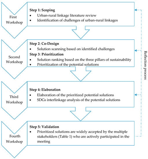 Step 1 was a scoping process and it included a literature review and identification of urban-rural challenges through an expert scoping workshop held in Tokyo, Japan, in January 2018. For the literature review, Google Scholar, Science Direct, and Scopus were used for searching the papers. “Urban-rural linkage” and “rural-urban linkage” were the search words used. Other words included “rural-urban continuum”, “rural-urban development”, and “rural-urban gradient”. Only articles published from 2000 to 2018 were considered. The duplicates were removed, abstracts were screened, and, finally, content analysis and relevance were used as some of the inclusion and exclusion criteria. Fifty-six papers were reviewed and potential solutions were identified.