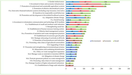 The results revealed that gender inclusiveness was ranked first as a significant potential solution for enhancing sustainable urban-rural linkages (n = 20). The results also showed that the establishment of large-scale industries was the lowest ranked solution for strengthening sustainable urban-rural linkages (Figure 3). On the basis of the expert and stakeholder rankings (n = 20), the top five potential solutions (Figure 4) were gender inclusiveness, investment in economic infrastructures, modernization of agricultural systems, innovative financial inclusion, and the promotion of a decentralization system that is based on the total score.