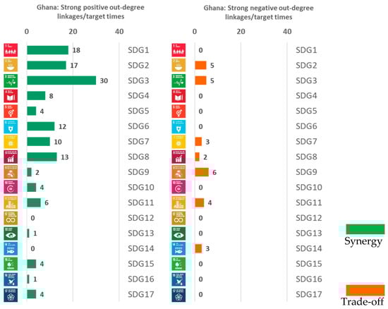 In step 4, the top five potential solutions prioritized were elaborated upon giving specific examples of interventions. Only the top five solutions were dealt with due to time constraints during the third workshop held in Accra, Ghana, on 23–24 January 2019. An SDG interlinkages analysis was also performed for the top five potential solutions. The SDG interlinkages process and visualization identified the causal relationship of the 169 targets and their 232 trackable global SDG indicators from significant data sources, including the United Nations Sustainable Development SDG indicators database, the World Bank SDG database, and other United Nations databases []. A correlation analysis was performed on the identified and available indicators at the national level []. The correlation coefficients, which ranged from −1 to 1, indicated the linear relationship between relevant targets. The positive coefficients represented positive linear relation (synergies) and the negative coefficients represented negative linear relations (trade-offs) []. The SDG interlinkages analysis and visualization using this method have been previously applied to Asian countries, including China, India, Japan, the Philippines, and Vietnam [], but were yet to be applied in an African context.