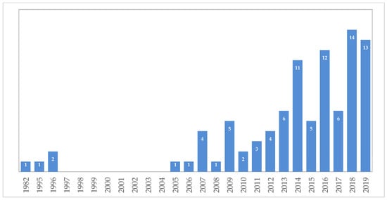 As can be seen in Figure 1, the numbers of academic articles per year in the area of sustainability in M&A processes are presented. It can be observed that the first publication was in 1982, in the journal Economics Letters by Oliner [28]. Until 2006, research had focused on issues related to the management of M&A processes, the achievement of cost and productivity effectiveness, and strategy. In this context, research on sustainability management was relegated to the background.