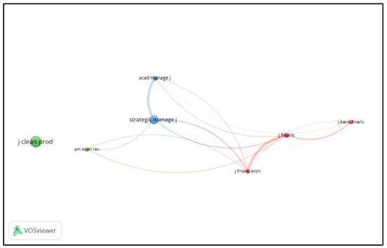 The journal co-citation analysis contributes to the study of the thematic organization of the research field of M&A and sustainable practices [52]. The greater the frequency of citations from two sources together, the greater the similarities between the journal and its research areas. In our sample of 92 documents, a total of 2772 cited sources were identified, of which 8 met the threshold of a minimum of 30 citations of a source. As can be seen in Figure 5, each node represents a journal. In addition, the node size represents the number of citations received. The distance between two journals in the visualization approximately indicates the relatedness of the journals in terms of co-citation links. The strongest co-citation links between journals are also represented by lines.