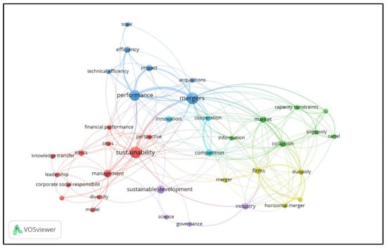 In all the 92 M&A and sustainability-related publications, we obtained 758 keywords altogether, and the terms occurring in at least three publications were considered. The results of the analysis are presented in Figure 6. As can be seen, the circles represent the occurrence of the keywords. In this way, the higher the weight of an item, the larger the label and the circle. The distance between the circles represents their relationship in terms of the number of times that the keywords occur together. The closer two keywords are located to each other, the stronger their relatedness. The strongest co-citation links between them are also represented by lines—the thicker the line, the stronger the link.