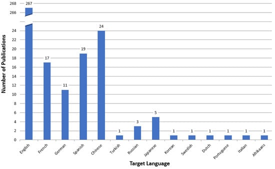 Figure 1 presents the target language that research has focused on. English was the most commonly used target language in reviewed articles (n = 267). The second most common target language was Chinese (n = 24).