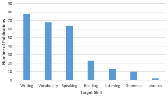 The researchers focused on improving different language skills, such as writing, vocabulary, speaking, reading, listening, grammar and phrases, using technology (Figure 2). In some studies, scholars focused on one single skill and in some others on more than one. As shown in Figure 2, researchers paid more attention to improving writing and speaking skills as well as vocabulary of language learners.