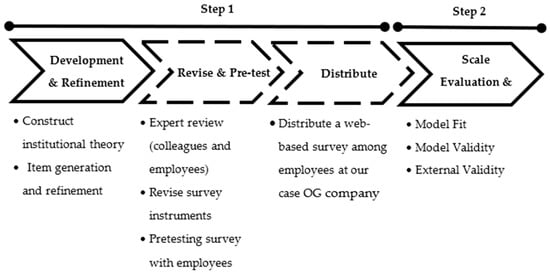Thus, we developed a survey instrument that allowed us to empirically validate a survey that measures the profile of the company’s employees as a key driver for legitimizing a sustainable future, as shown in Table 2. This section contains a brief review of our methodological approach, adopted from MacKenzie, et al. [70], as shown in the scale development procedure in Figure 2. In the first step, we developed and refined our institutional measures, then we created our survey, pre-tested, and distributed it. These measures were used in the scale evaluation and validation as a second step.
