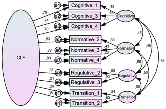 The shortened scale, with three cognitive, three normative, two regulatory, and two sustainability toward transitions items was retained. Thus, the CFA was performed on the 91 responses by adding the CLF in order to capture the common variance among all observed variables in the model.