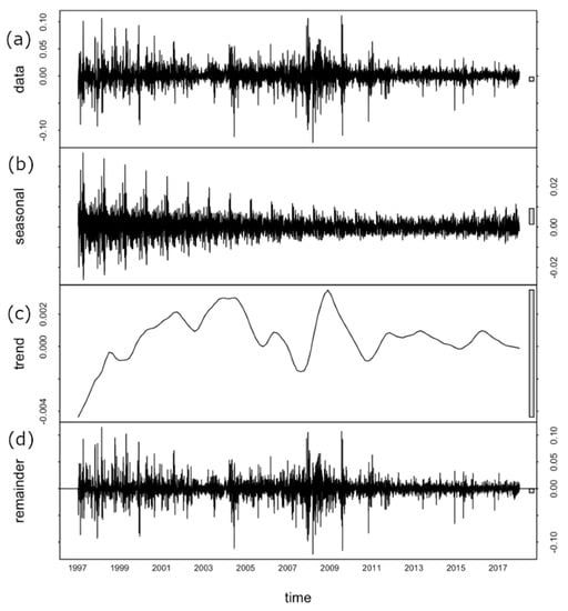 In this study, the STL decomposition is implemented in the R statistical package using the stl function of the stats library [51,54]. We set the function parameters as follows: (i) the span of the loess window for seasonal extraction (s.window) is set to 21 (i.e., the number of trading days in a calendar month); (ii) the number of backfitting iterations (inner) is set to 1; (iii), the number of outer iterations (outer) is set to 15; (iv) the degree of locally-fitted polynomial in seasonal extraction (s.degree) is set to 1; the other parameters are left as default. The parameter choices in (ii) and (iii) are robust iteration options necessary to minimize effects of outliers, and (iv) is necessary for better handling of seasonal effects.