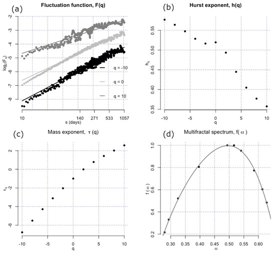 Figure 2 reveals, by way of illustration, the MF-DFA results for the remaining component of the Romanian stock market index, BET (shown in Figure 1d). The MF-DFA results of other stock returns time series are similar and are available in the Supplementary Materials. As can be seen in Figure 2, the presence of scaling for any q is pointed out by the fluctuation functions, which are well fitted and present a straight line in log–log scales. The Hurst exponent (H) is estimated with the help of F2. In the case of stationary series, the Hurst exponent is computed by setting q = 2 for the scaling exponent. In our case, H = 0.49, which suggests that there is a low persistence that characterizes the remaining component.