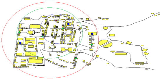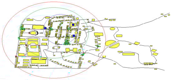 The experiments divide the shelters in different locations into three levels: level 1 is in the most densely populated area with the lowest replenishment capacity; level 2 is locations that depart from each other slightly where replenishment capacity is the medium; level 3 is the most decentralized layout in which the replenishment ability is the highest. In this experiment, the designed replenishment capacity can be noted as 1-1-1, 1-1-2, 1-2-3 corresponding to Figure 3, Figure 4 and Figure 5, respectively. The blue circle is the first-level shelter, the green circle is the second-level shelter, and the red circle is the third-level shelter.