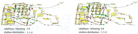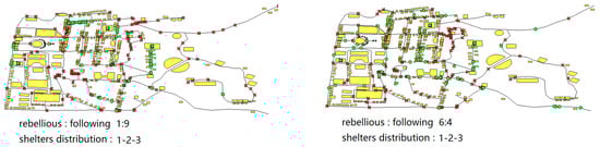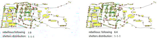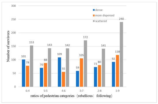 Scenario simulation requires the discretization of parameters. Assumptions for scenario settings are also required. In emergencies, pedestrians are inclined to follow the crowd []. So, in general, rebellious pedestrians are less than the following type. In the parameter discretization, the interval is set as 10%, so the ratios are 6:4, 5:5, 4:6, 3:7, 2:8, and 1:9. In each experiment, the survival proportion of each crowd is evolved. The shelters are distributed in three states: dense, dispersed, and scattered. The discretization strategy may lead to different scenarios, including massive overlapping scenarios. We use a conventional strategy of parameter discretization, which can cover the basic possible scenarios.