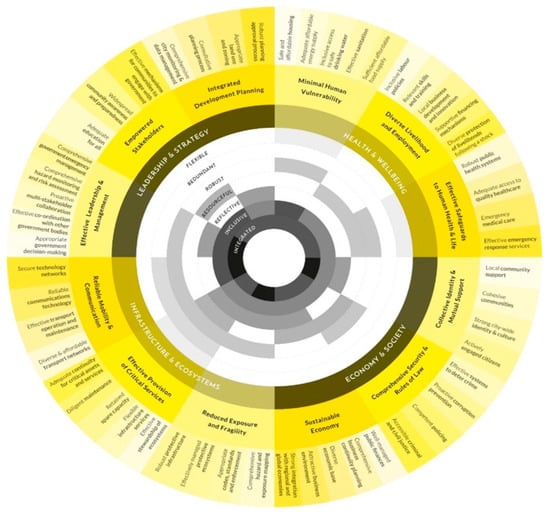 City Resilience Index. Source: The Rockefeller Foundation and Arup (2016). Available online: https://assets.rockefellerfoundation.org/app/uploads/20171206110244/170223_CRI-Brochure.pdf (accessed on 10 December 2019).