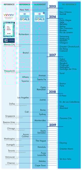 From 2017 onwards, a number of cities (10) reference other global development agendas, such as the Sendai Agreement for Disaster Risk Reduction, adopted in March 2015 (Ramallah, Palestine; Santa Fe, US; Sydney, Australia; and Vancouver, Canada); the Paris Climate Agreement, adopted in December 2015 (Paris, France; most of the US cities such as Dallas, Chicago and Washington; Toronto, Canada; Huangshi, China; Singapore; and Chennai, India—which refers to both the Sendai and Paris agreements); or the New Urban Agenda, adopted in October 2016 (many of the Latin American cities such as Quito, Ecuador; Montevideo, Uruguay; and Buenos Aires, Argentina as well as Thessaloniki, Greece; Santa Fe, US; and Melaka, Malaysia).
