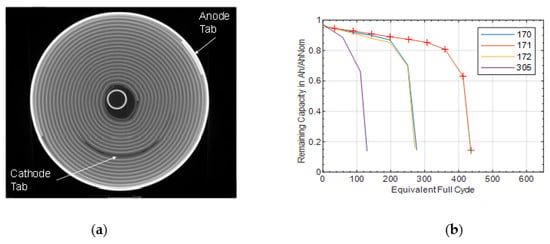 (a) Computer tomography (CT) measurement of an as-received Samsung 35E (347) with the location of the electrode tabs. (b) Remaining capacity over equivalent full-cycle measured during check-ups with a current of 0.5 C of Samsung 35E (170, 171, 172, 305) of the electrical ageing at a mean state of charge (SOC) of 50% and a cycle depth of 50%. Each cell was displayed in a different color. The red crosses mark the time of the check-ups.