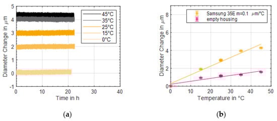 Based on these results (Figure 2a), a relationship between diameter change of the lithium-ion battery together with the strain gauge and the temperature can be derived, see Figure 2b. The strain gauge and the Samsung 35E together are changing their diameter by 0.1 µm/°C.