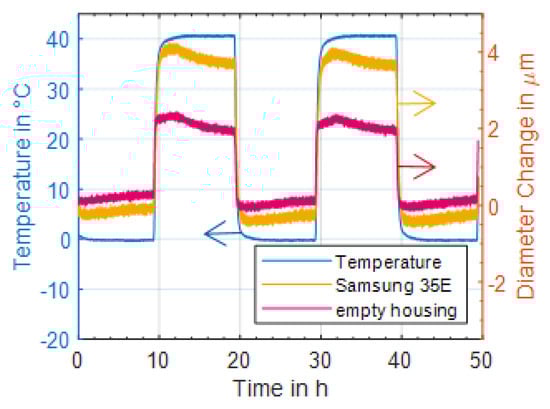 Measurement of the diameter change on a Samsung 35E (197) lithium-ion battery during temperature cycling between 0 and 40 ℃. The temperature of the climate chamber was changed every 10 h.
