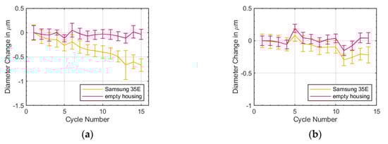 The temperature cycle stability is shown in Figure 4 based on the measurement shown in Figure 3. In Figure 4a the mean results and the standard deviation of 40 °C of the Samsung 35E and the empty housing are shown. The mean results and standard deviations were calculated from the results shown in Figure 3. At 40 °C, the mean diameter change of the empty housing was stable with a maximum standard deviation of 0.1 µm. The mean diameter change of the Samsung 35E was decreasing with the temperature cycle number with a maximum standard deviation of 0.33 µm. Figure 4b shows the mean results and the standard deviation at 0 °C. At 0 °C, the same behavior can be observed. The maximum deviation of the Samsung 35E and the empty housing was 0.1 µm and 0.1 µm, respectively.