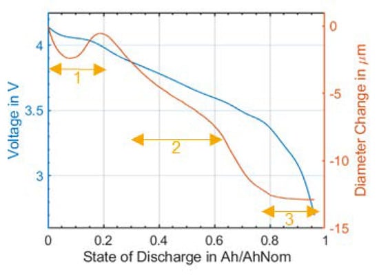 At the beginning of the discharge, the diameter change decreases until it reached a minimum of at approximately 10% state of discharge. Then, the volume rised again up to a maximum at 20% state of discharge in area 1 in Figure 5. The maximum was below the diameter at the beginning of the measurement. Afterwards, the diameter change decreased again. Between a state of discharge of 40%–60%, the diameter change was flatter than before. An area with a constant gradient can be seen in area 2. From 60% state of discharge onwards, the diameter change decreased again until it flattened out, starting from 75% onwards and remained constant until the lithium-ion battery was discharged in area 3.