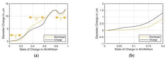When comparing the diameter change of a charge and discharge of a lithium-ion battery, the shape differed, see Figure 6a. When the lithium-ion battery was charged, its change in diameter increases directly from 0% onwards, see Figure 6b. When it is discharged, the range up to 10% SOC was rather flat. The area with a constant gradient between 40% and 60% SOC was more pronounced with the charge than in the discharge, see area 2. This is where the deviation was most noticeable. During discharge, the slope at 30% SOC was greater than during charge. Furthermore, the turning point became less evident at 60% SOC. The charge and discharge curve cross each other at 30% and 70% SOC. Afterwards, both curves take the same course. The minimum at high SOCs is showing the same for both the charge and the discharge, see area 1.