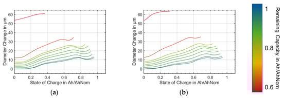 Figure 7 shows the diameter change due to ageing as a function of SOC and capacity (a) discharge and (b) charge. Each curve represents one check-up performed on the same lithium-ion battery. All curves were normalized to the diameter of the beginning of life check-up.