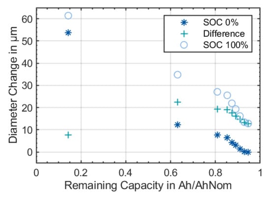 The diameter change of the discharge process was around 10.7 µm with a standard deviation of 4.4 µm for an as-received lithium-ion battery. Rather large variations in battery production and ageing characteristics could be the reason for the large deviation in diameter change [31]. Further results illuminated this aspect and will be reported elsewhere.