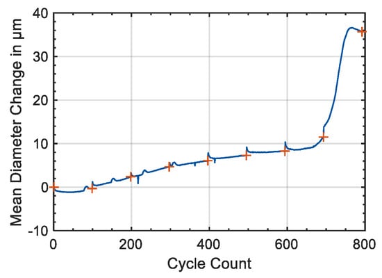 Looking at the increase of the mean diameter change not during the check-ups but during the cyclisation, it can be seen that the mean diameter change increased slowly up to a cycle number of about 700 cycles, shown in Figure 9. Afterwards there was a steep increase in the mean diameter change. This process fits very well to the previously shown diameter changes during the check-ups, shown in Figure 7 and Figure 8. There are small increases in the mean diameter change due to the check-ups.