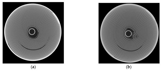 CT measurement of (a) an as-received Samsung 35E (347) and (b) the aged Samsung 35E (171) at a remaining capacity of 0.1 Ah/AhNom. Winding deformations in the middle of the jelly roll are clearly visible.