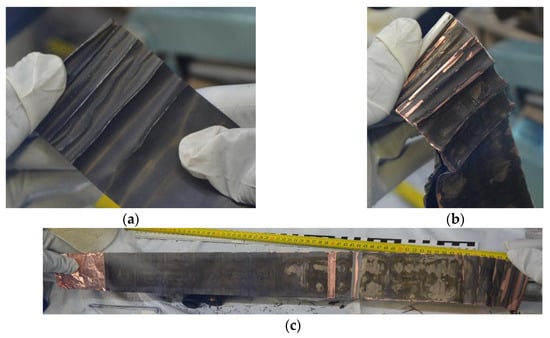 When the aged battery was opened, clear deformations were visible in the cathode and anode, as can be seen in Figure 12a,b. In addition, a grey covering layer was formed, especially in the middle part of the jelly roll. This part started after the cathode tab. The position of the cathode tab was clearly visible on the anode due to the complete absence of the coating and the visible copper current collector (Figure 12c).