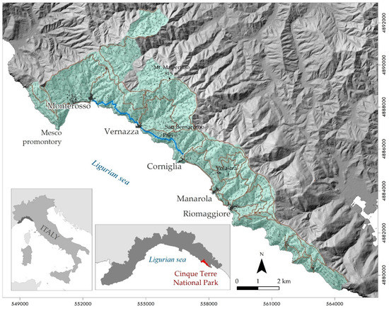 The Cinque Terre National Park area, covering approximately 38 km2, despite the seaside location, displays a prevalently hilly mountainous environment with an altitude ranging from sea level to approximately 800 m a.s.l. This area is characterized by a series of southwest-facing small catchments with very steep slopes, limiting in some cases narrow coastal plains and often reaching directly to the shoreline, which is mainly shaped by rocky cliffs. This morphological setting promotes the activation of diverse geo-hydrological instabilities, especially during flash floods that frequently affect the area [7,8].