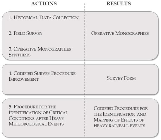 Based on the available information and experiences gained during previous adverse meteorological events, a codified methodology was proposed. The foreground has been primarily acquired by investigating the effects of severe floods in recent years in the Liguria Region, among which is the flood of 2011 [3,21,24], and considering other events such as those in November 2014 [17,21], and November 2016 [22]. This procedure is aimed at developing an approach that is standardized as much as possible for field survey operations to be carried out after relevant rainstorms and is useful for “multi-user” exploitation during the occurrence of emergencies.