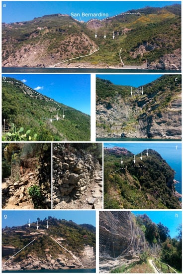 In addition, such coastal stretching is characterized by widespread rock falls and degradation scarps along the SVA trail. Some known large dormant or relict landslides cross the trail, such as (i) the Guvano landslide, a complex slide extended from the San Bernardino hamlet (350 m a.s.l.) to the seaside and currently monitored by a series of permanent GNSS stations [32,41]; (ii) the Macereto area, an extended area affected by widespread rock falls, in several sectors stabilized with different slope protection measures (e.g., rockfall barriers and gabionades) [30]; (iii) the Vernazza rock planar slide, stabilized with a set of hobnails [30].