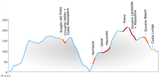Sketch of the “Sentiero Verde-Azzurro” trail profile characterized on the basis of the degree of hazard with respect to the recognized geo-hydrological instabilities described in the OMs: high interference in red, medium degree in orange, and low degree in yellow.