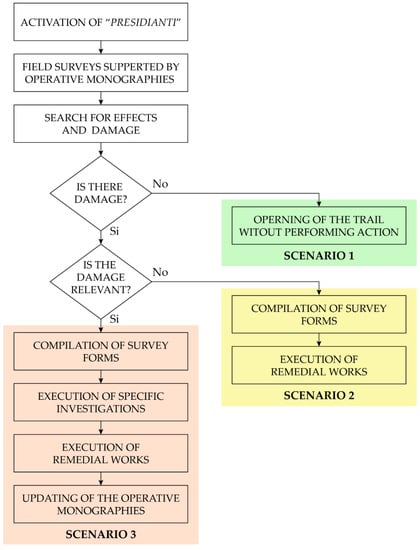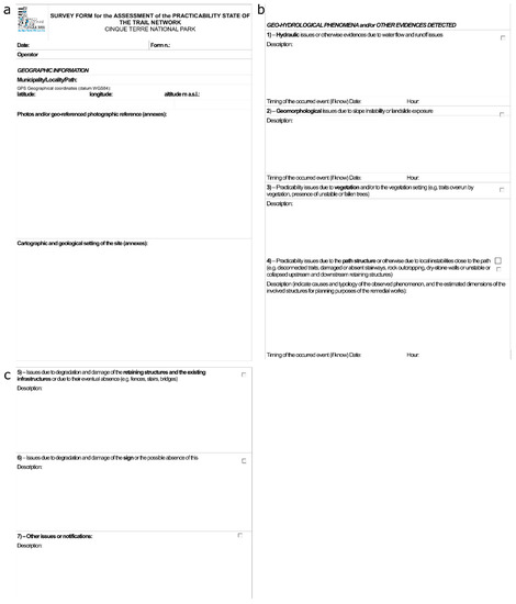 Commonly, after heavy rainfall occurs, e.g., 25 October 2011, the closure of the entire path network becomes necessary. At this stage, survey operations are carried out by the so-called “Presidianti”, i.e., adequately trained and skilled geologists, entrusted with the identification of the occurrence of geo-hydrological processes and damage. “Presidianti” are also trained in the use of OMs that provide a ready-to-use document able to supply a reasoned summary of the overall framework of this peculiar territory, focusing on the main geo-hydrological hazards and criticalities already present (and known) along the trail path. The identification of something that could hamper the reopening of the trail is supported by the use of SFs, which support the “Presidianti” in the data collection, using a homogeneous approach. Starting from the development of the procedure, we also defined several possible scenarios and the sequence of activities to be carried out before the reopening of the trail.