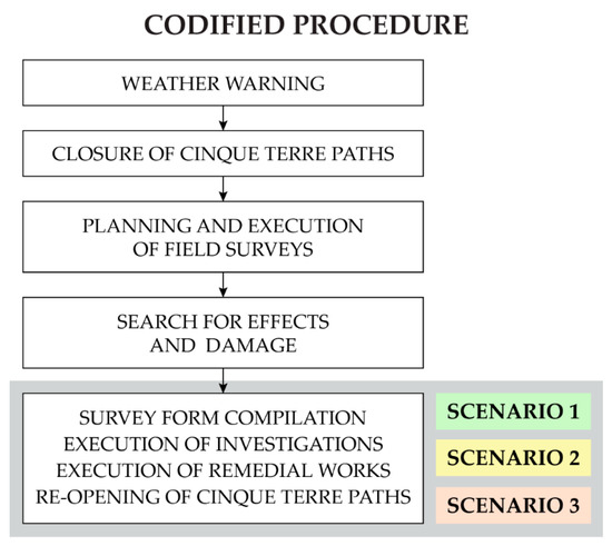 A procedure aimed at addressing the needs of the Cinque Terre National Park for useful geo-hydrological risk management was implemented. The main goal was to establish a repeatable and effective procedure to be applied after relevant meteorological events affecting the Park territory. This requirement was born from previous experiences [34] in which we realized that the lack of a standard way to collect and organize data and information about geo-hydrological phenomena and related damage could be a crucial problem in landslide risk assessment and management. For several years, the use of defined methodologies and specific protocols has been considered quite usual and well-established in some specific fields for emergency management [60,61]. For example, for the International Civil Aviation Organization (ICAO), in the medical framework or in industrial risk management, the adoption of standard protocols is mandatory to define the specific actions that competent institutions and stakeholders should execute. This led us to find a proper solution in geo-hydrological risk management in this unique landscape through the definition of a predefined protocol to adopt in the case of severe meteorological events. However, it is important to note that, with respect to, for example, an industrial accident, in the case of geo-hydrological risk, this codification is difficult to achieve due to the high variability in data and involved entities. Diverse scenarios could take place, mainly on the basis of typology and the characteristics of the occurred phenomena and related damage. This large range of possibilities overcomplicates the drafting of the procedure. Therefore, we defined a methodology that is based on two instruments (the OMs and the SFs) and on the definition of three possible scenarios.