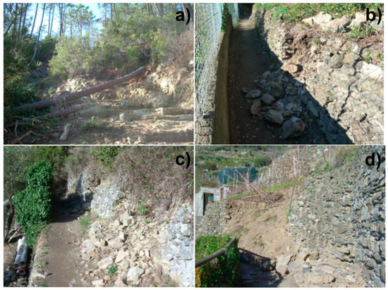 The occurrence of numerous floods during the recent decades highlighted how disruptive these events could be, particularly for environmental and cultural heritage [43]. In the study area, one of the most recent and severe floods occurred on 25 October 2011 in response to extreme rainfall [3,27]. In the Mediterranean area, this event represents one of the most severe rainstorms in recent years, in terms of both rainfall intensities and cumulative rain quantities [44,45,46,47]. This rainstorm was responsible for intense erosive processes and triggered numerous shallow landslides that increased the sediment yield and the power of flow along streams, leading to severe flash floods of the hamlets of Monterosso al Mare [27] and Vernazza [3]. The amount of economic and structural damage was relevant both for villages and people. Moreover, many terraces were disrupted, and some stretches of the hiking trail were affected by landslides, causing the closure of part of the trail network. After such a disastrous event, according to the land management strategies adopted by some local municipalities, numerous remedial works were planned to stabilize the most unstable slopes and the most problematic stream segments [33,48]. On slopes, several types of solutions have been adopted to reduce rain-wash effects and to consolidate the areas affected by shallow landslides. Moreover, reinforcements of dry-stone walls were also performed. On the other hand, along streams, most of the interventions were carried out with the aim of improving flows and restoring the former flow sections. Geo-hydrological risk mitigation measures allowed the restoration of hiking paths and related facilities to give tourists the opportunity to visit this beautiful and unique environment. In recent years, the GRSC has promoted multidisciplinary studies and activities aimed at examining the state of the conservation, efficiency and damage of both geo-hydrological risk mitigation measures and hiking paths after the occurrence of severe rainstorms. A survey form (SF) has been implemented to properly support the work of surveyors after severe hydro-meteorological events. The adopted SF allows an effective and fast inventory of damage and rainfall-induced hydro-geomorphological effects along the hiking trail. This procedure is expected to provide a useful contribution in terms of civil protection measures by decreasing the exposure of trail users to geo-hydrological risk.