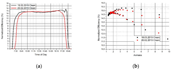Comparison in normalized efficiency between clean surface on 18.03.2019 and clean surface on 20.02.2019—reference condition. (a) Normalized efficiency as function of time of day. (b) Normalized efficiency as function of air mass.