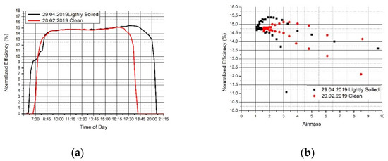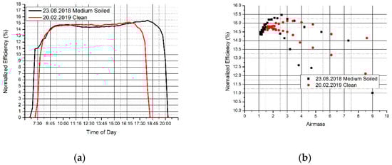 Comparison in normalized efficiency between a medium soiled surface on 23.08.2018 and a clean surface on 20.02.2019. (a) normalized efficiency vs time of day; (b) normalized efficiency vs Airmass.