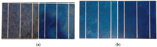 Dust accumulation on PV panels’ surface. (a) Medium soiled on 23.08.2018. (b) Clean PV panels’ surface on 20.02.2019.