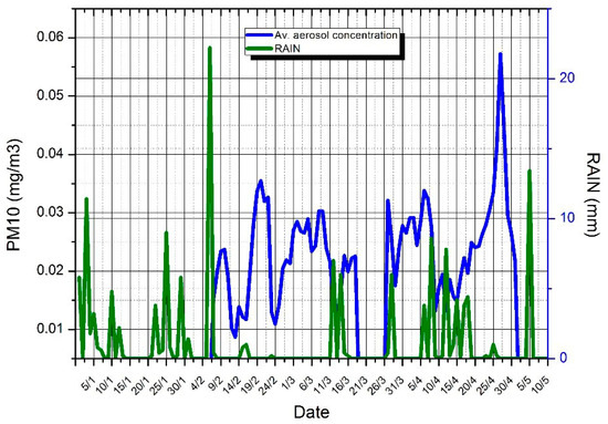 Correlations among the normalized efficiency, irradiance, clearness index, and aerosol concentration are attempted in this section, starting from a correlation of precipitation with aerosol concentration (Figure 11). Three periods with recorded values of ambient aerosol concentration are examined next (Figure 12).