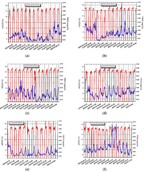 As a starting point, the correlation between normalized efficiency and ambient aerosol concentration is presented in Figure 12 for the specific periods: Several peaks of aerosol concentrations are recorded during the night, due to the effect of water vapor condensation on these nights [19]. Very low aerosol concentration is recorded during rainy days (Figure 11), (which obviously have very low irradiance levels), due to the nucleation and washing of particulate by the rain drops. Also, low aerosol concentration is observed on some cloudy days. The above remarks explain the lack of a straightforward correlation between normalized efficiency and aerosol concentration. Another interesting phenomenon that is observed in these recordings is the transport of African dust in the period from 15.04.2019 to 28.04.2019, depicted in Figure 12d with an increasing trend in ambient PM10 concentration. Again, in this case, there is no obvious direct correlation of ambient PM10 concentration with efficiency. During periods with high relative humidity at the site, one may observe high particulate concentrations at night, where the temperature drops close to the Dew Point. Morning moisture produced by condensation in such cases may contribute to self-cleaning of the panels and increase in PV panels efficiency. This phenomenon is more pronounced in Figure 12f in the period from 26–29.4, where night particulate concentrations are very high, resulting at improvement of PV efficiency during the subsequent days. As observed in Figure 11 for the respective days, no significant precipitation is recorded. Thus, monitoring of precipitation alone cannot explain this type of phenomenon. As a general remark, one could say that the correlation of ambient PM10 concentration with normalized efficiency at a specific day must take into account the PM10 concentration history during the preceding days.